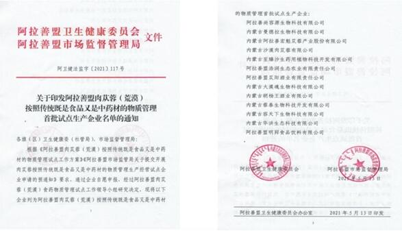在国家实施健康中国的大趋势、大环境下,2021年5月13日,内蒙古自治区阿拉善盟卫生健康委员会和阿拉善盟市场监督管理局联合下发文件,公布了阿拉善肉苁蓉(荒漠)按照传统既是食品又是中药材的物质管理,肉苁蓉被列为药食同源目录中。并公布首批试点生产企业名单,内蒙古华洪生态科技有限公司(阿拉善肉苁蓉精华饮等产品生产企业)成为首批试点企业之一。
